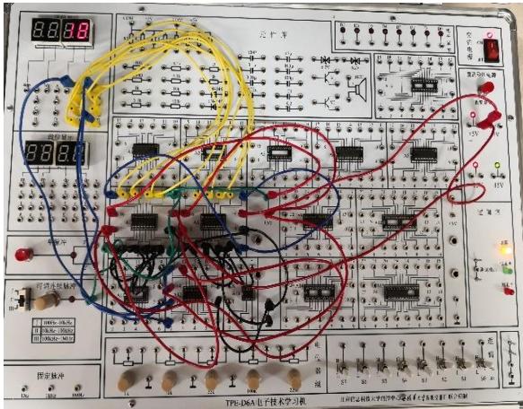 1)发放74LS160等耗材,在数电实验箱上搭建完成学号的显示;