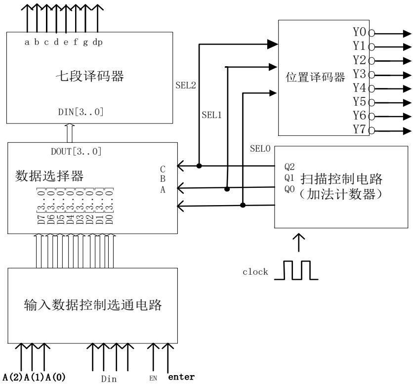 本实验除了学号静态显示外,还基于本中心自制的含有输入模块的拓展板设计了基于FPGA的学号动态显示,其结构框图见图9.