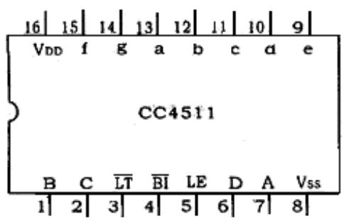 BCD码/数码管译码原理见图5,实现译码功能的常用芯片有74LS47、74LS48、4511等,其中 4511 引脚如图 6。