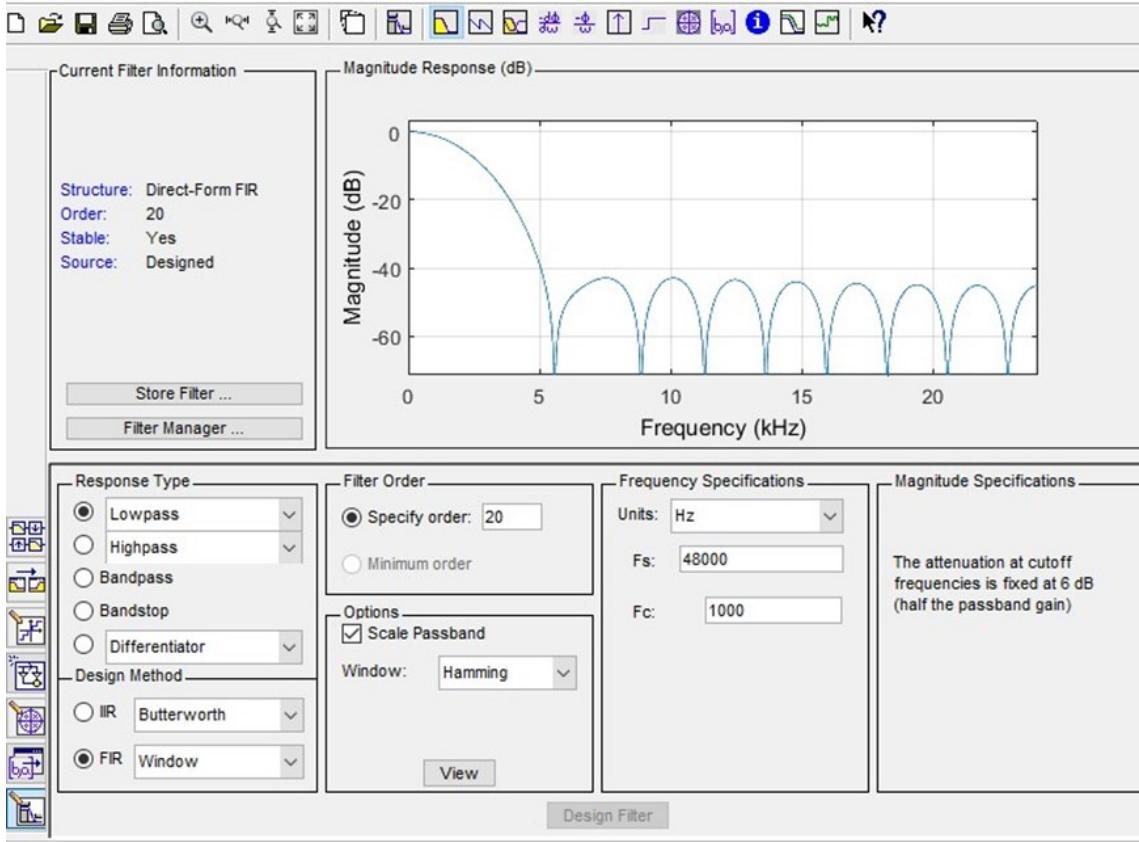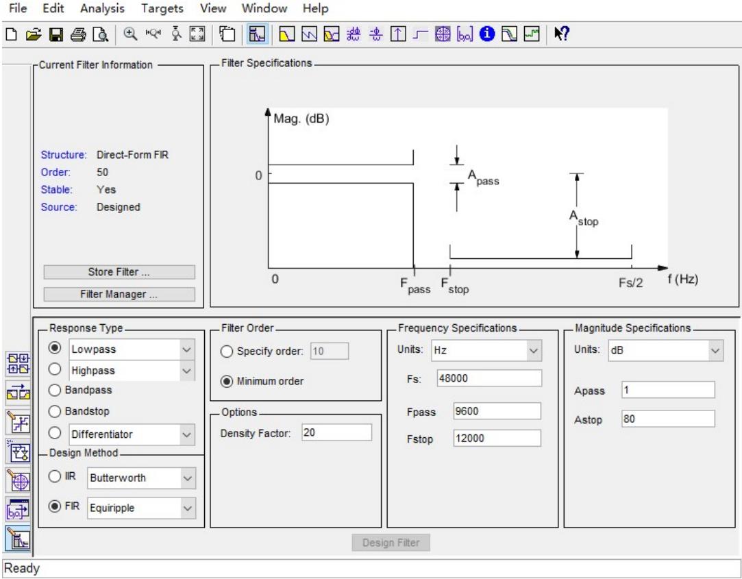 选择滤波器设计的参数,如低通、fir、窗函数设计法,选择为 hamming窗,采样率 48000Hz,截止频率 1000Hz,阶数 30 阶,点击 Designer Filter进行滤波器设计;