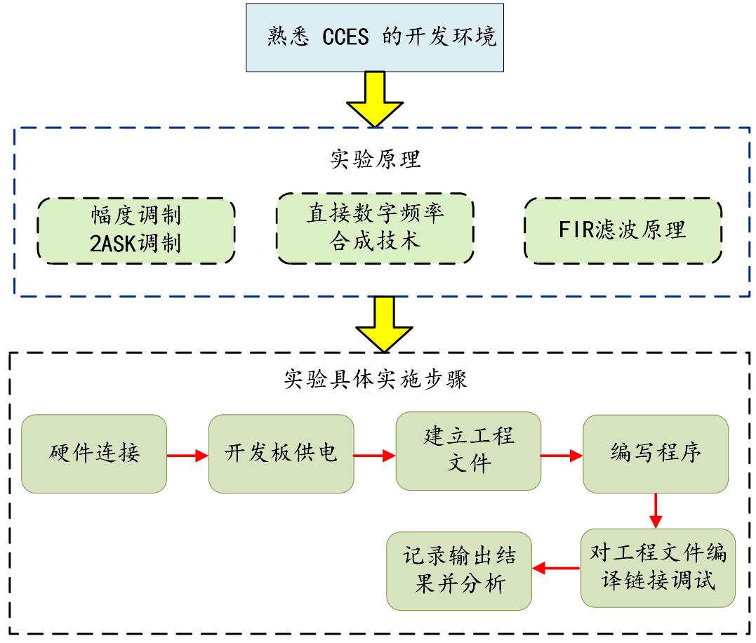 本实验室基于嵌入式多核处理器开发环境的信号采集与实时处理的课程案例,能加深对调制过程的理解,可以牢固掌握对直接数字频率合成技术生成信号的学习,可以有效通过窗函数法设计滤波器。实验环境为:安装有 CCES 软件的计算机、 BF609 教学板、信号发生器、示波器。整体的实验方案如下:
