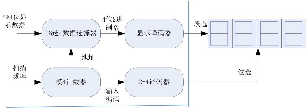 7)得分显示模块,需要设计 4位动态扫描数码管显示控制电路,电路主要思路如下图所示。