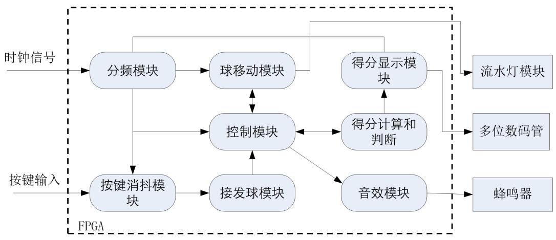 基于FPGA和给定电路模块,设计并实现一个接发球游戏模拟机,用发光二级管的亮灭模拟球运动的轨迹,用按键开关模拟接球和发球,计算得分并显示。实验设计操作过程由浅到深、逐级深入,在有限的实验教学课时数内,完成复杂数字电子系统的设计。