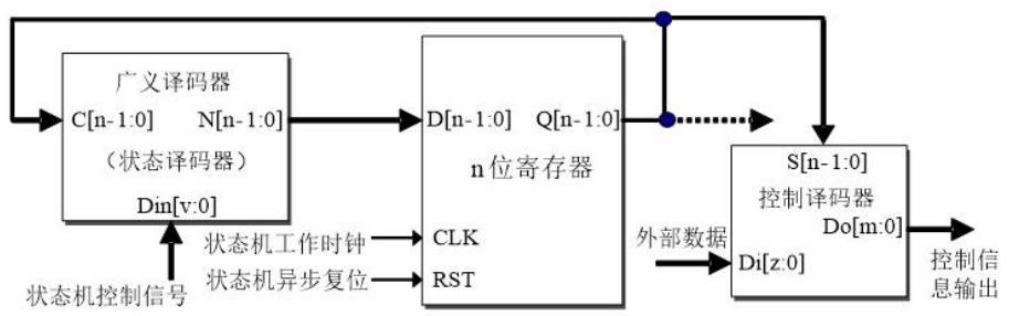 时序电路的一般模型如下图所示,其中状态译码模块即实验4中所学的广义译码器模型,实现状态机的现态到次态的变化,n 位寄存器组实现状态机的时序,控制译码器实现控制信息的输出。