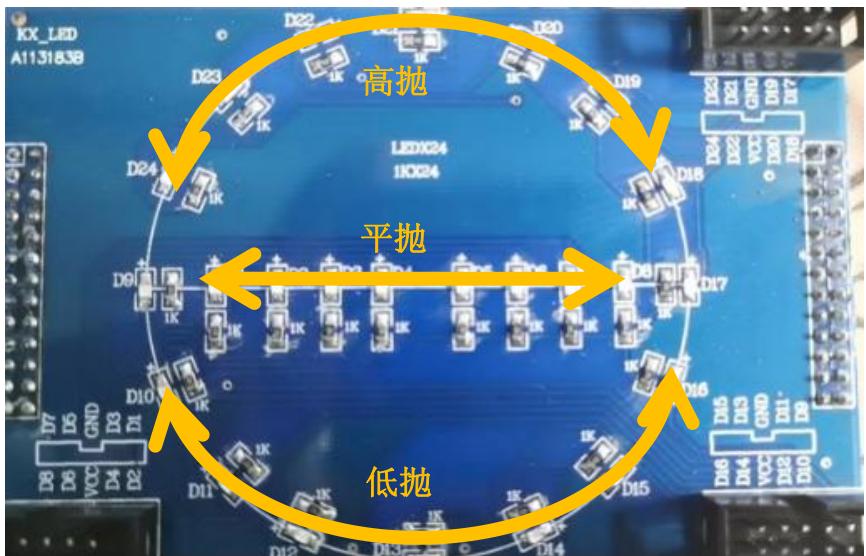 4)接球可以选择高抛、平抛、低抛三种不同模式,控制显示球运动在不同轨迹上,如下图1所示。