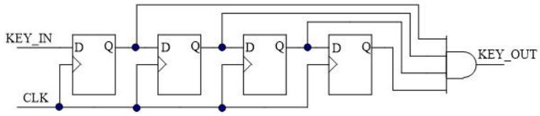 4)按键消抖模块。由于按键为机械开关,按下和松开都会产生抖动,有可能影响接发球的判断,所以设计按键消抖模块。这里主要是采用硬件延时消抖的方法,可以使用多个触发器级联延时,如下图所示,或写Verilog HDL代码延时消抖。