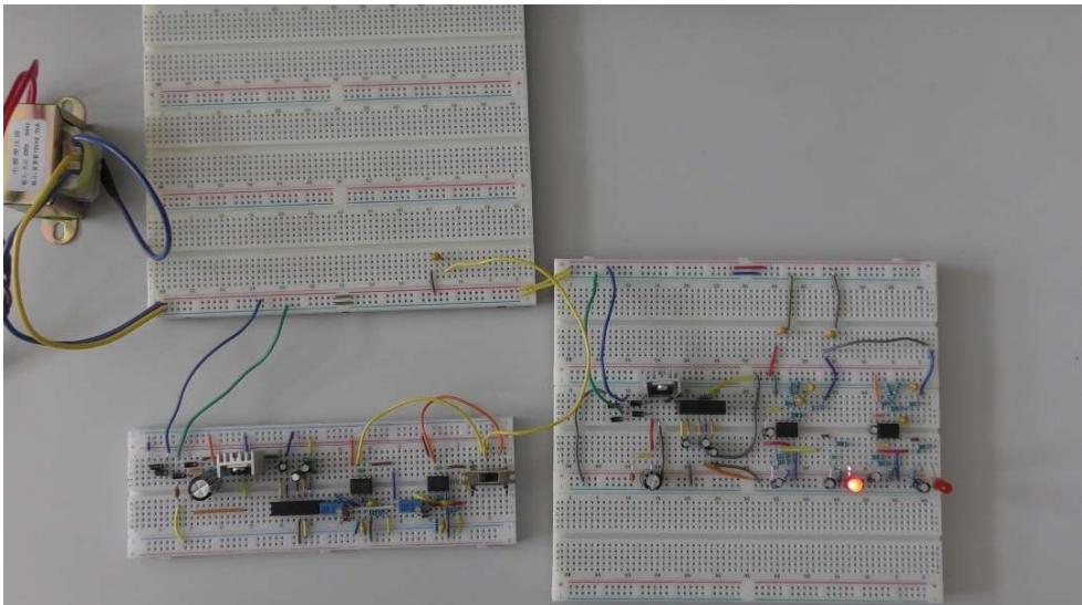 在传输线上加载有效值为 12V/50Hz 的交流电,发送端依次将代表数字‘0’和‘1’的两种频率正弦信号加载到传输线上,在接收端对两个频率信号进行识别、显示。