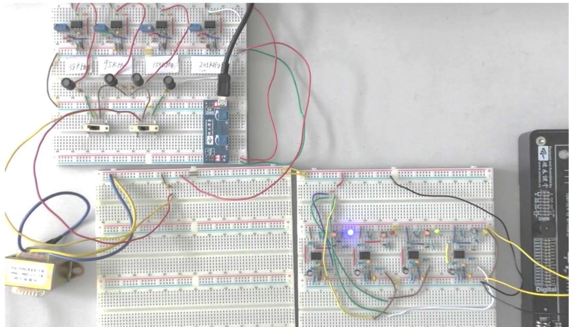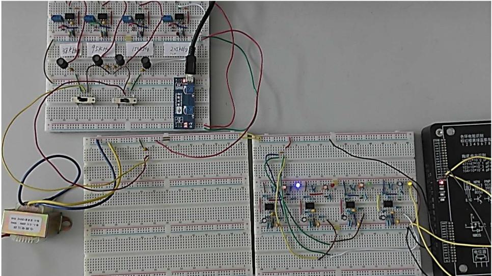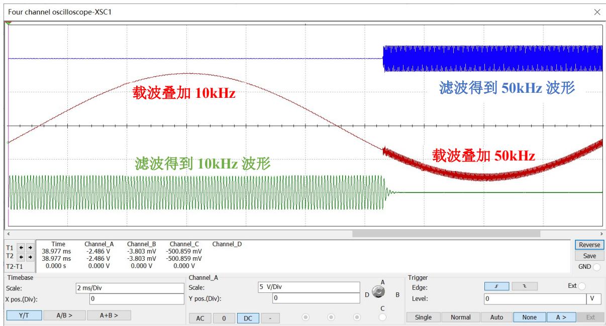11.结合无源带通滤波器实验内容,实现多对频率信号同时发送、接收,即多位频率同步传输功能。
