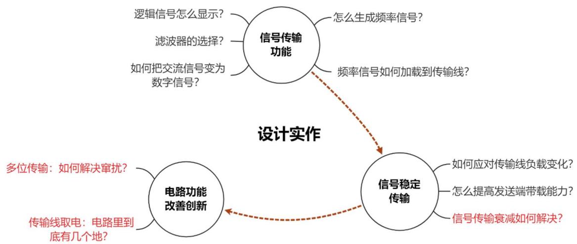 从易到难,由浅入深,从搭接方式、频率选择、滤波器设计开始,进而到传输线负载变化、大电压载波等方面,引导学生发现工程中可能遇到的问题,尝试寻找解决办法,培养学生有序设计的习惯、缜密思维的品质。