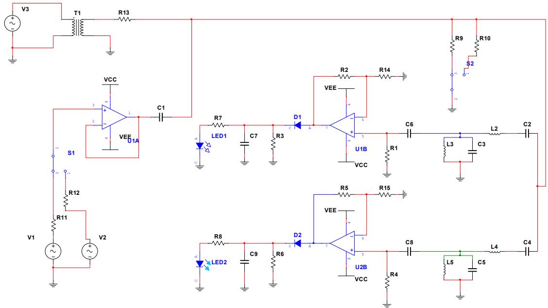 - 按照由易到难、先仿真验证后实作调试的原则,设计带通滤波器、检波器等模块电路并进行调试。