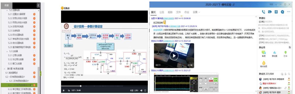 本阶段,学生通过 SPOC 教学视频对前序知识点进行再学习,使用仿真软件 $^ +$ 口袋实验室对电路各模块进行设计调试,教师通过QQ 群在线答疑。