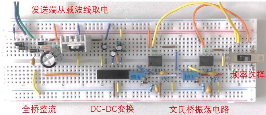 结合直流稳压电源、带阻滤波器等实验内容,实现发送端、接收端控制电路从传输线取电功能。