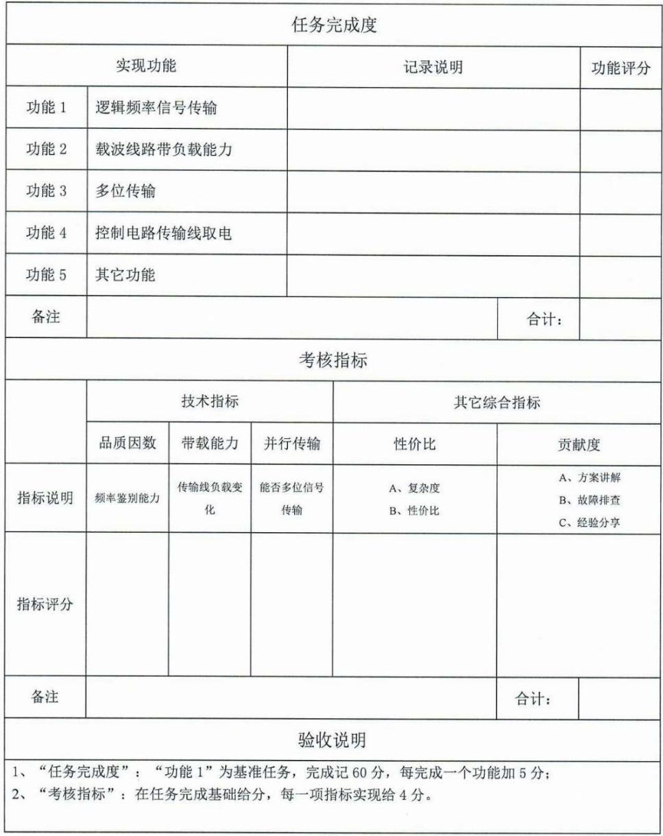 如图7-8所示,使用 “数字频率传输验收表”对学生的作品进行考核。验收评分不仅关注完成度,也使用性能指标考核(如:品质因数、带载能力、性价比等),督促学生设计出更好的作品。