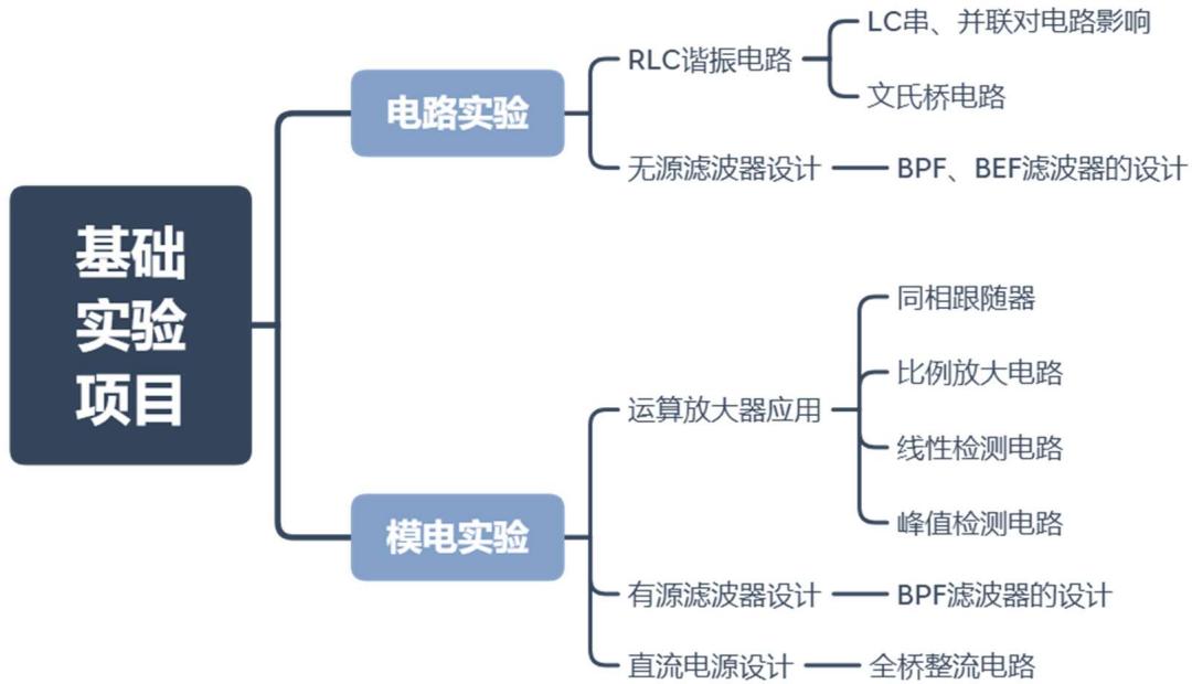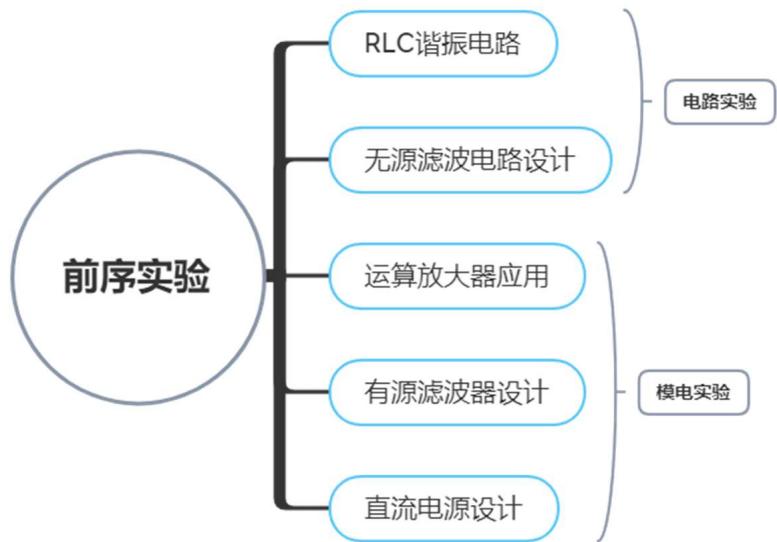 如图 7-2 所示,学生在电路实验中完成 RLC 谐振电路、无源滤波电路设计实验项目,在模拟电子技术实验中完成运算放大器应用、有源滤波器设计、直流电源设计等实验项目。在以上实验项目实施的基础之上开展本案例。