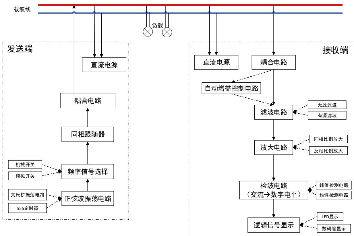 本次实验中的数字频率传输是以低压电力线作为传输媒介,在 $5 0 \mathrm { H z }$ 载波上叠加不同频率的正弦信号实现数据的传输,是电力线载波通信的物理层简化实现方式。系统结构如图 8-1 所示。