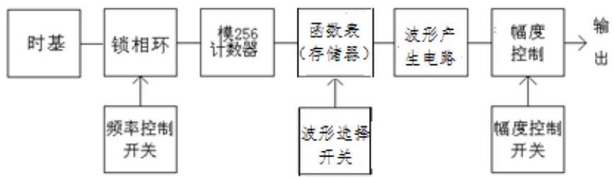 图 1 可作为参考系统框图。频率控制开关控制数字频率控制电路的输出信号频率,由此改变计数器的循环计数速度。计数器作为存储器的地址发生器,依次存储器中取出正弦信号的样值,该样值经 D/A 变换后产生正弦波信号。幅度控制开关控制幅度控制电路,使输出信号的电压幅度变化。