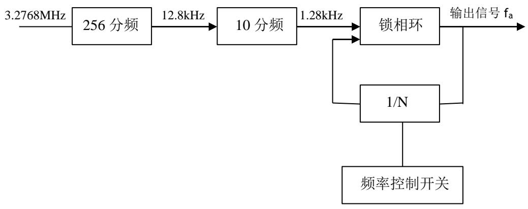 频率控制电路包含时基电路、频率控制开关和锁相环(PPL)电路。PLL 的VCO输出波形为 TTL 脉冲波。若要求输出正弦信号频率为 $1 0 \mathsf { H z } \sim 1 . 2 5 \mathsf { K H z }$ ,则要求模 256计数器输入时钟信号的频率范围为 $2 . 5 6 \mathsf { K H z } \sim 3 2 0 \mathsf { K H z }$ ,即频率控制电路产生的脉冲波频率范围的下限应为 2.56KHz,上限应为 $3 2 0 1 / 1 2$ 。为此,将选定的 3.2768MHz 晶振经过2560分频产生 1.28KHz时基信号,PLL 电路中的程序分频器为8 位二进制计数器,频率控制开关也是8位,控制程序分频器的分频比为 $2 \sim 2 5 0$ ,利用锁相环倍频功能,产生 2.56KHz 至 320KHz 频率的 TTL 脉冲波,频率步进为 1.28KHz,再经过256个地址计数器的分频可以得到最小 5Hz频率。