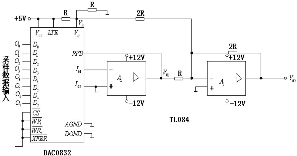 模拟正弦波产生电路采用 D/A 变换器实现,参考电路如图 3 所示。设计时应注意, $\mathsf { V } _ { 0 1 }$ 是一单极性电压,其电压值由下面的公式得出。为了使正弦信号的输出不含直流分量,需要产生 $\mathsf { V } _ { 0 2 }$ 作为输出信号,实现双极性输出。这里 $V _ { R } = 2 . 5 V$ ,Vopp $\mathtt { \Pi } = 5 \mathtt { V }$ 。