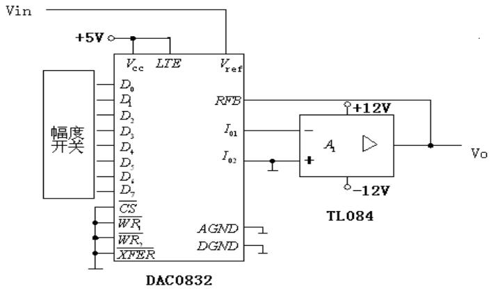 幅度控制电路如图 4所示,由D/A电路构成。正弦信号从 Vref输入,利用 DAC0832内部的R-2R电阻网络构成衰减器,实现幅度的程控放大。幅度开关有6 位(相当于64个档位),分别接入 ${ \mathsf { D } } _ { 2 } { \sim } { \mathsf { D } } _ { 7 }$ ,在这6位开关的组合下,输出信号的幅度控制范围可以从 $0 \sim 5 \mathsf { V }$ ,步进大约为 $7 8 \mathsf { m } \mathsf { V }$ ( $\scriptstyle \langle 5 / 6 4 = 0 . 0 7 8 1 2 5 \rangle$ )