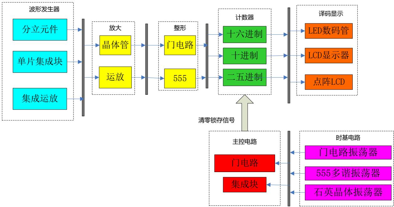 在较为完整的项目实现过程中引导学生了解波形产生的基本方法、信号频率的基本测量方法、数字显示的方法,各单元模块实现方法的多样性及根据任务需求比较选择技术方案;引导学生根据需要设计电路、选择元器件,并通过测试与分析对项目作出技术评价。