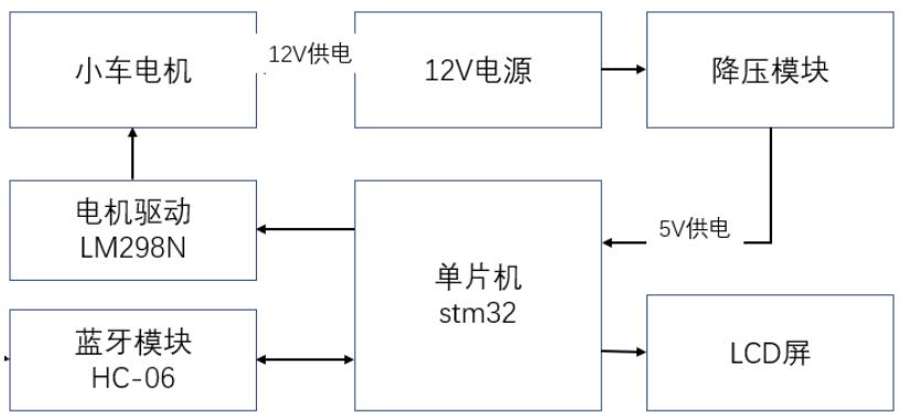 电机控制模块:stm32 通过 PA3,PA4,PA11,PA12 连接电机驱动输出 PWM 波控制小车直流电机运