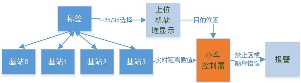 将三边定位及 TOF 算法在定位设备中调试成功之后,设计小车,主要由通信模块,电机驱动模块,显示模块三部分组成。定位模块由 T0、T1 等手环标签到 A0、A1、A2、A3 基站计算飞行时,基站设在实验室高度高于 $1 , 8 *$ 位置,测试阶段可用三脚架固定基站,每次测试基站位置一致。待测试完成将其固定于墙面等不易移动位置,即四个基站三维坐标确定。