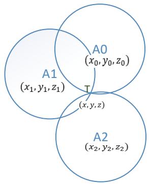本设计采用计算移动点 T 与 4 个基站(A0、A1、A2、A3)的距离,再计算 T 点坐标,取均值,得到最终移动点坐标。即以基站 1 组(A0、A1、A2)、2 组(A1、A2、A3)、3 组(A0、A2、A3)、4 组(A0、A1、A3)获得4 组移动点位置,再取 4组移动点的平均值作为最终移动点输出。