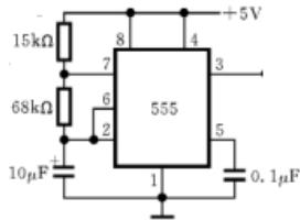 555 定时器是一种中规模集成电路,外形为双列直插 8 脚结构,体积很小,使用起来方便。只要在外部配上几个适当的阻容元件,即可连接成多谐振荡器电路。多谐振荡器又称自激振荡器,可以对外产生连续脉冲信号。先计算好要选用的电阻、电容参数,然后按照 555 定时器芯片连接为多谐振荡器方法连接电路即可输出所需的周期为 1S的脉冲信号。