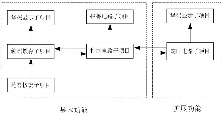 如图 5 为项目主体框架及各子项目划分,包括抢答按键子项目、编码锁存子项目、译码显示子项目、定时电路子项目、报警电路子项目、控制电路子项目等。