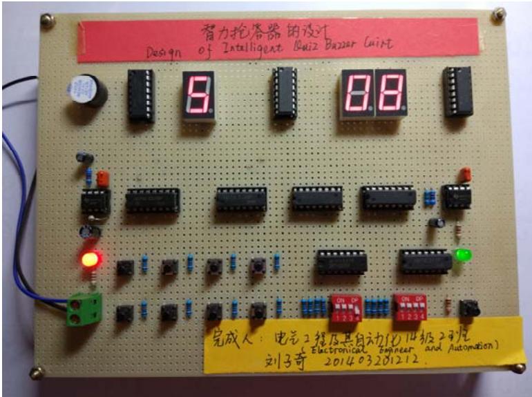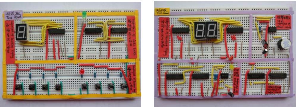 由于面包板插拔导线、元器件简单,使用灵活。因此,在本次实验中,首先采用面包板将上述子项目电路逐一连接与测试。面包板变身成为子项目电路测试板,如图 3 所示,学生在面包板上将抢答按键子项目、编码锁存子项目、译码显示子项目、定时电路子项目、报警电路子项目以及控制电路子项目连接并通过测试。再利用万能电路板进行整体项目电路的焊接与调试如图 4 所示。对比学生在面包板上连接的各个子项目电路(图 3)和用万能电路板焊接的整体项目电路(图 4),可见,子项目电路单独调试比整体项目电路焊接、调试更加容易。采用先用面包板实现子项目电路的方式提高了电路的可靠性,使学生更好的理解子项目电路功能及设计方法,学生的实验成功率提高,提升了学生的自信心和实验热情。通过前期在面包板上的电路连接、测试,学生具备了整体项目电路设计能力,在此基础上,在万能板上焊接整体项目电路自然水到渠成。同时,通过面包板、万能电路板的二次电路连接与测试,提高了学生的电路硬件连接、焊接和调试能力。
