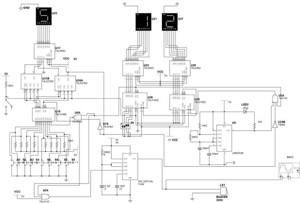 74LS148 2 片 74LS279 2 片 74LS48 4 片74LS192 2 片 NE555 2 片 74LS00 1 片发光二极管 2 只 共阴极显示器 4 只 74LS121 4 片