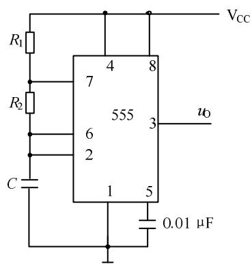 555定时器构成的多谐振荡器,通过调节R1、R2及C的值来改变振荡器频率,控制报警声音,其中: