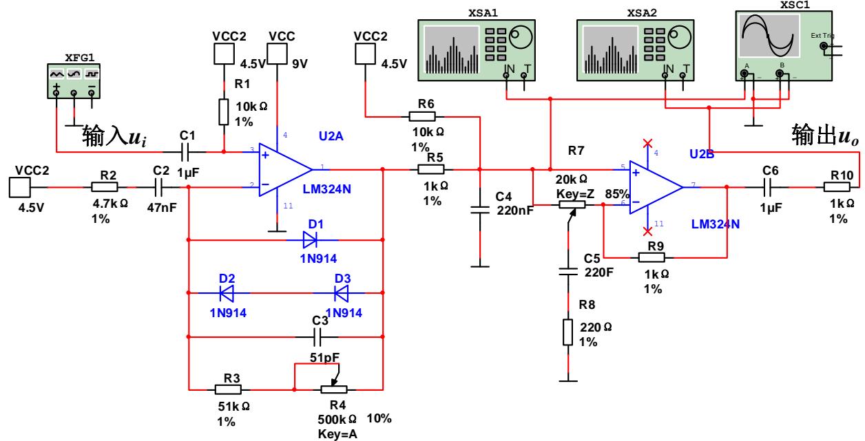 5) 电路中的运放可选择通用型号,如 LM324、NE5532、uA741等,鼓励学生设计单电源供电电路,更加贴近工程应用场景。