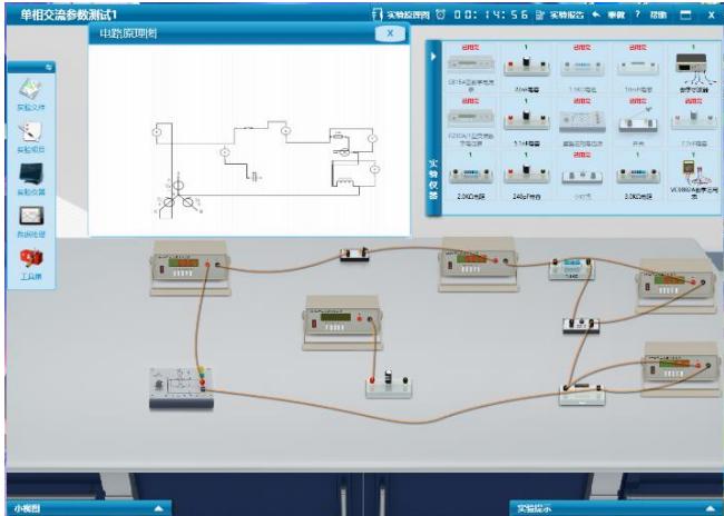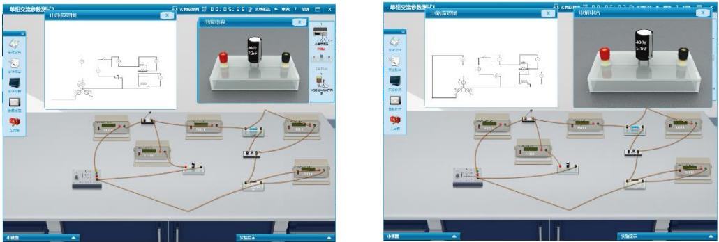 3)使用平台上所提供的元器件测试电感电压,总电流,电容电流等量,引导学生在缺少功率表的情况下,计算出功率因数,掌握各功率与电路中各部分元件的关系。