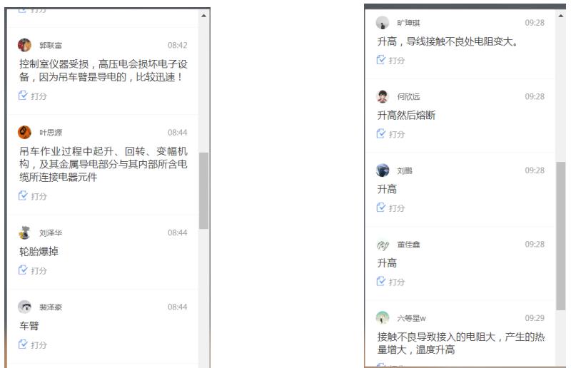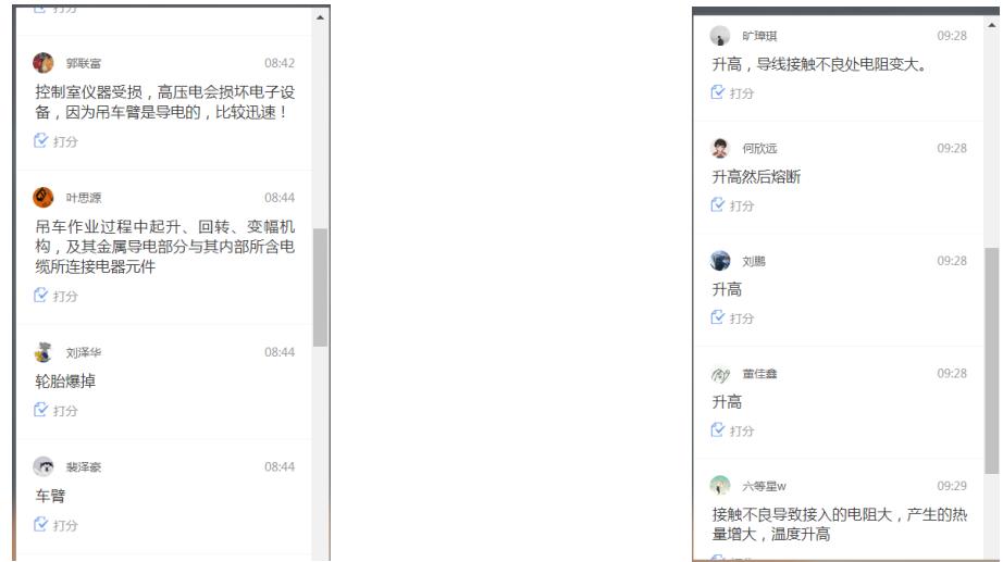 4)用两个实际工程案例引入线下实验,锻炼学生独立思考的能力,帮助学生建立理论与实践之间的桥梁: $\textcircled{1}$ 如果一台吊车,其车臂接触到 110kV 高压线,最先损坏的是车的哪个部位? $\textcircled{2}$ 一个电力系统中,导线某一点发生接触不良,导线的温度应该如何变化?使用雨课堂 app实时得到学生的反馈。如图 11所示: