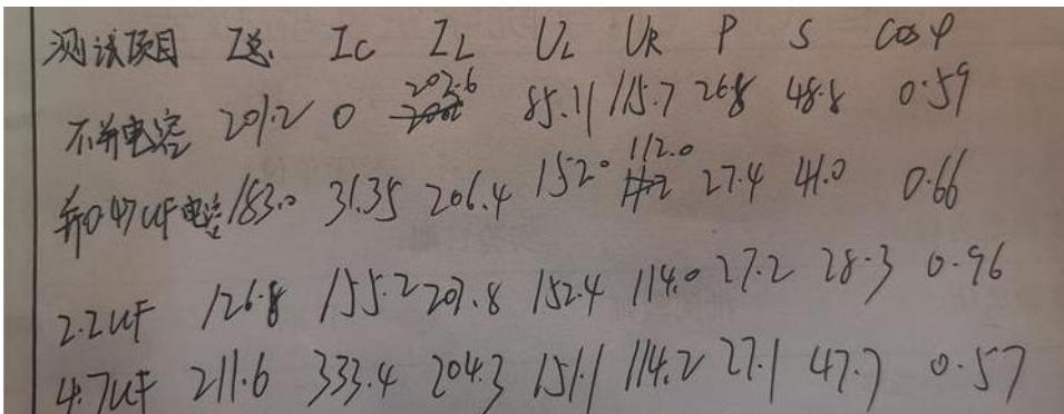 3)学生根据线上测试数据结果,计算出电路功率因数,并总结提高电路功率因数的方法。