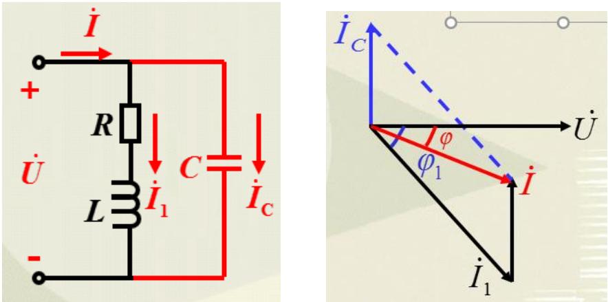 一般由于功率因数过低,会导致负载对电源能源利用率降低,还会导致电路中损耗增加,因此国家电网和南方电网规定,用电器如果要接入电网,一般要求其功率因数在 0.85 以上。而如果要提高电路的功率因数,需要保持原有用电器的工作状态不变,即原支路有功功率不变,因此一般采用并联电容的方式,提高感性电路的功率因数。感性电路并联电容后,其电压和电流相量关系如图 13 所示: