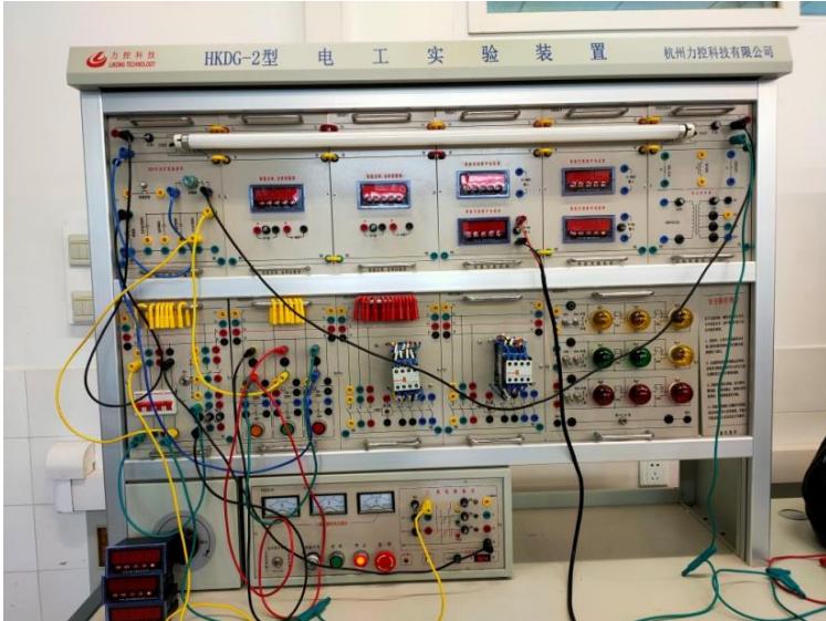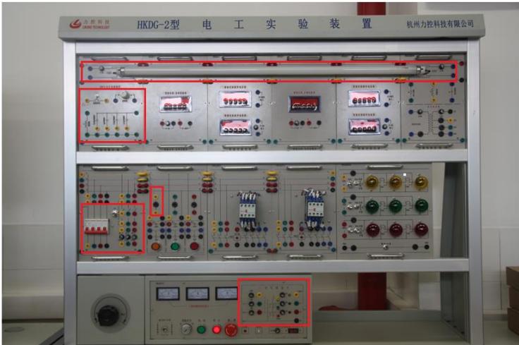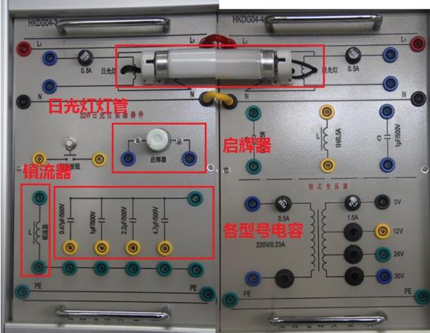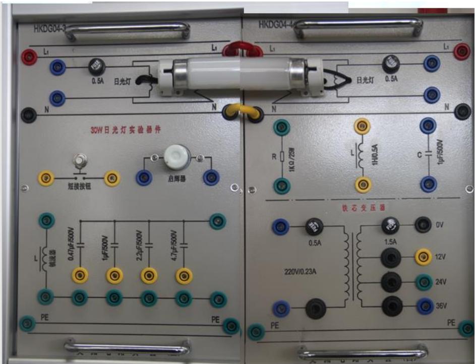 在线下实验过程中,主要使用的仪器设备包括,智能交流电压表,电流表,智能功率表,控制保护装置及日光灯及其组件等,以模块形式安装在电工实验装置中,如图4所示。