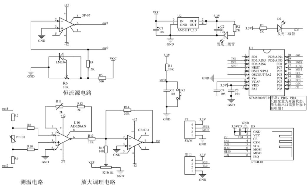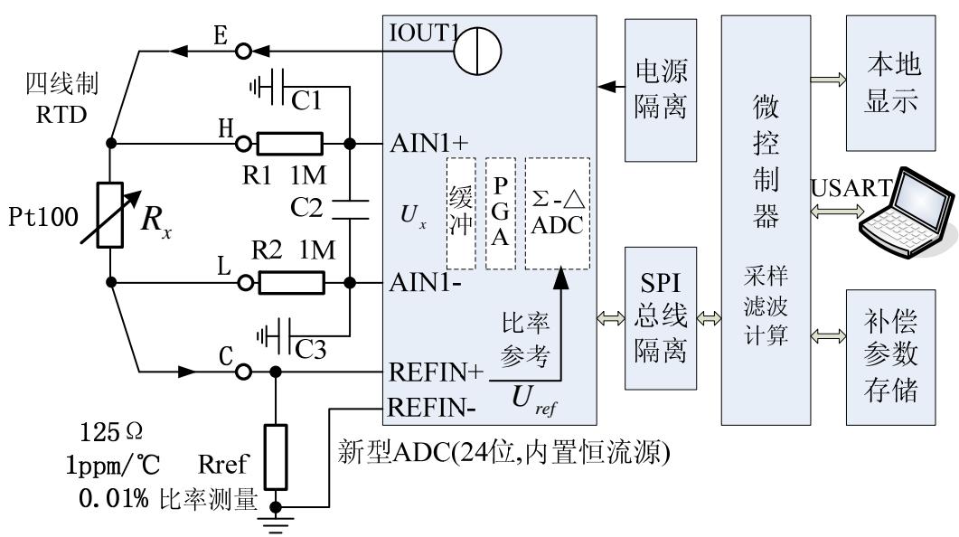 从PT100接线方式(二线、三线、四线制)、新型集成电路器件运用、比率式测量方法、线性隔离等角度出发,采取硬件措施保障系统的测量精度。
