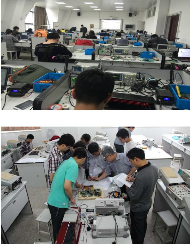 可选的实验项目包括:(1)基于PT100的四线制高精度测温系统、(2)基于DDS技术的宽带信号源、(3)程控宽带增益放大器的设计、(4)李萨如图形演示装置、(5)高精度信号变送装置、(6)温度等多要素记录仪的设计、(7)电感电容测量仪的设计、(8)基于CPLD或FPGA的VGA显示系统、(9)基于CPLD或FPGA的等精度数字频率计、(10)基于CPLD或FPGA的脉冲参数测量