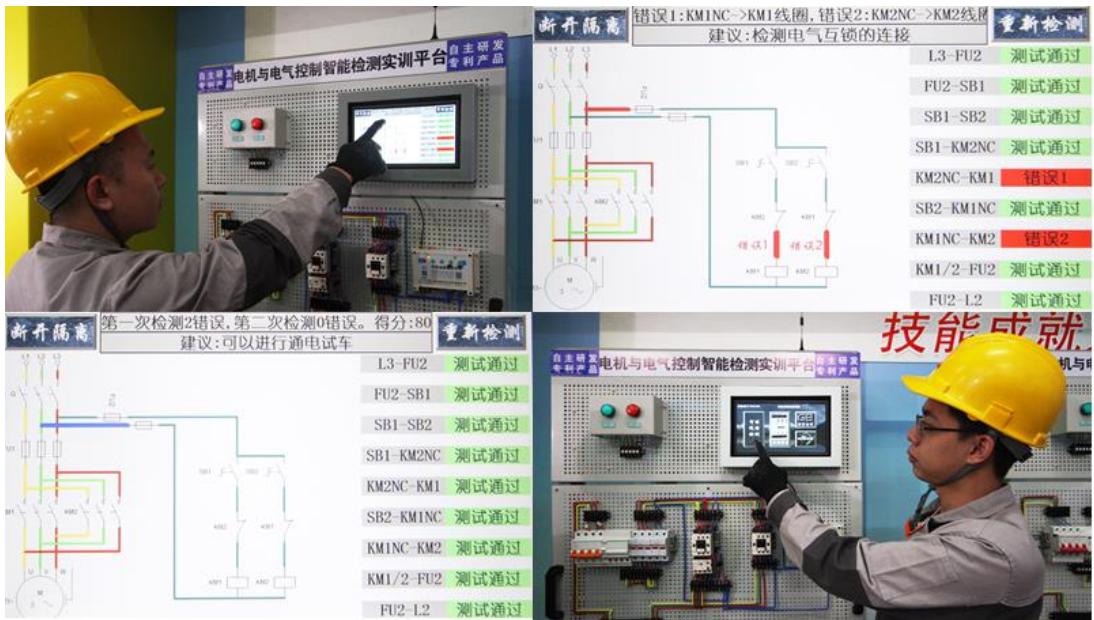 学生入校以来第一次接触到380V“强电”设备,以往学生在实操中对线路检测、调试无从下手,为保障通电安全需要教师耗费大量时间、精力辅助学生逐一进行线路检测,往往是“线路连接10分钟,等待检测1小时”,实操效率非常低,后续 380V通电试车的通过率极低。为此,自主研发“电机与电气控制智能检测系统”(见图13),辅助学生快速、精准对电机接线进行不通电测试,当检测到接线错误时,显示屏会标记出错误线路并语音提示检测及修改建议,在保证安全的同时节省大量时间,让学生在有限的时间内可以进行多次反复电路接线实操训练,达到熟记操作流程、巩固操作规范的教学目标。