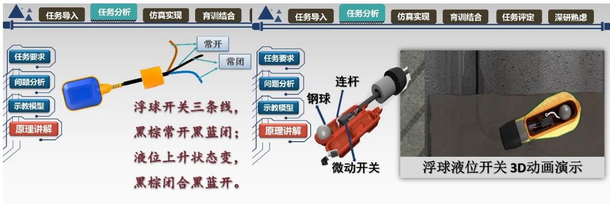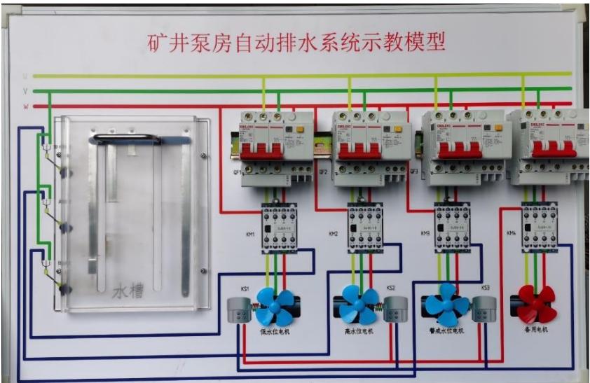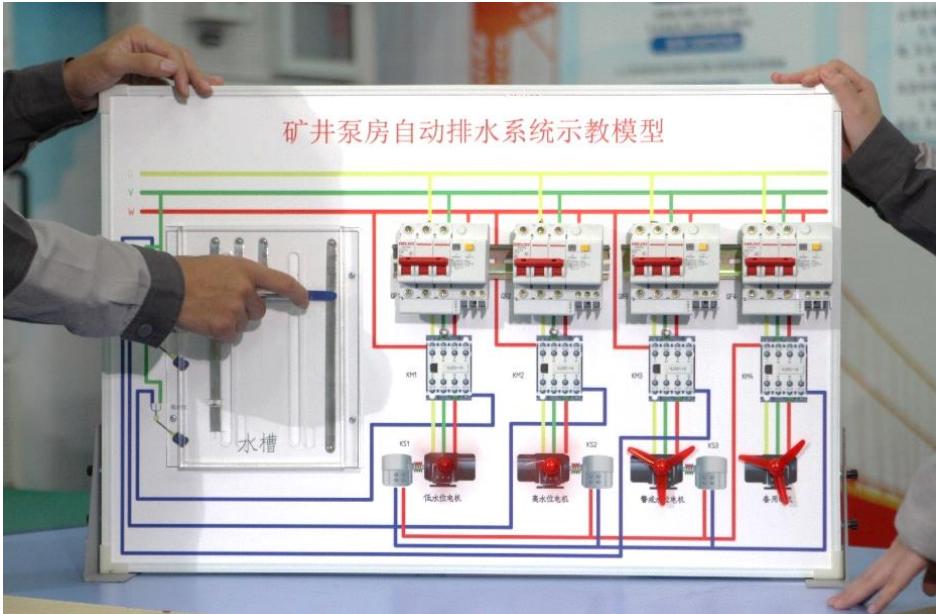 【析】:利用泵房自动排水系统示教模型分析讲解自动排水系统工作原理,该模型使用12V人体安全电压,学生可直接上手操作,还原真实工作任务,有效解决380V 用电危险等痛点问题,帮助学生理解泵房排水系统工作原理、电气互锁等教学难点。