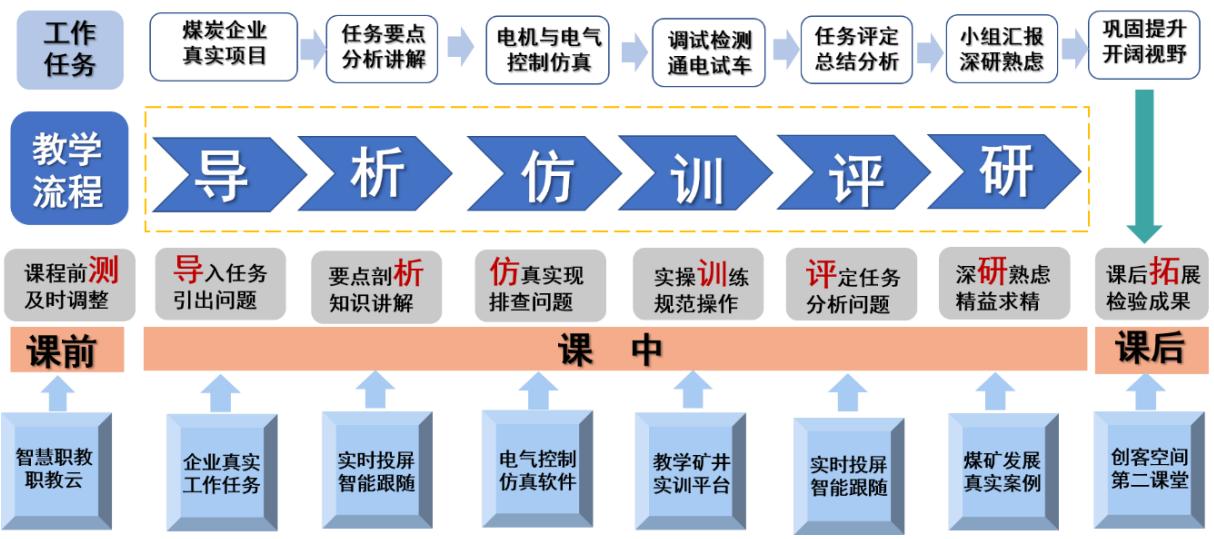 本项目以智能化改造真实案例为依托,根据学生认知规律,对接维修电工岗位能力要求,对接企业真实工作过程,全面融入《维修电工职业技能标准》,将教学内容进行梳理、筛选和重构,采用“导 $\twoheadrightarrow$ 析 $\twoheadrightarrow$ 仿 $\twoheadrightarrow$ 训 $\twoheadrightarrow$ 评 $\twoheadrightarrow$ 研”的教学流程(见图5)。