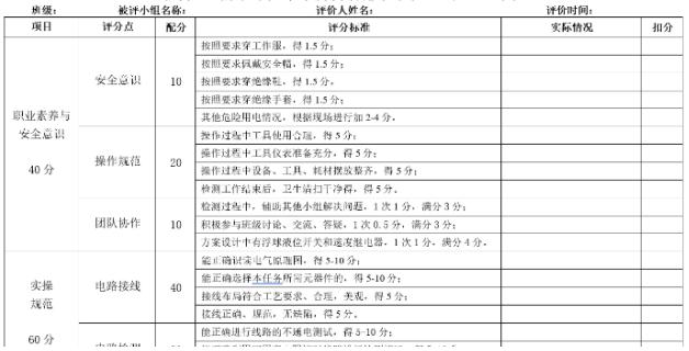 班级: 自评小组名称: 小组成员姓名: 评价时间:项日 评分点 配分 评分标准 实际情况 得分按照要求穿工作服得1.5分:1人未穿扣0.5分,扣宗为止:按照要求佩戴安全幅得1.5分:1人未戴扣0.5分,扣完为止:安全意识 10 按照要求穿绝缘幢得1.5分:1人未穿扣0.5分,扣完为止:按照要求穿绝缘手套得1.5分:1人未戴扣0.5分,扣完为止: