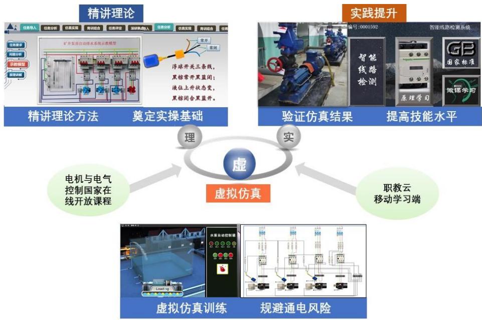 采用“精讲理论-虚拟操练-实践提升”的“理虚实”一体化教学过程(见图4):以维修电工职业技能鉴定标准为“理”,以“电机与电气控制仿真软件”为“虚”,以国家示范校重点建设实训基地一电机与电气控制一体化实训中心为“实”,虚实结合,优化资源,理论学习奠基础,虚拟仿真避风险,实操训练强技能。“理、虚、实”三个环节,环环相扣,互相支撑,突破教学重难点,提升教学效果。