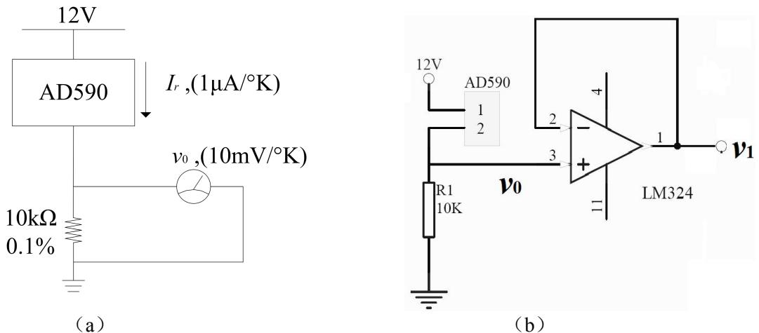图 4(b)所示为 AD590 传感器的实际测温电路。实际电路中,将 AD590与电阻串联,以实现将电流信号转化为电压信号,方便后续处理。采用一个 $1 0 \mathrm { k }$ 电阻和一个滑动变阻器串联的方式,目的是平衡 10k 电阻的阻值误差。实验电路前端使输出电压 $\nu _ { 0 }$ 随温度的变化关系为$1 0 \mathrm { m V / ^ { o } K }$ 。由于 $\nu _ { 0 }$ 需要很精确,且不能受到下级电路影响,故应该使用运算放大器做隔离处理。这时运算放大器用作电压跟随器,其输出电压 $\nu _ { 1 }$ 的值应约为 $( 2 7 3 + 2 5 ) \mu A \times 1 0 k \Omega = 2 . 9 8 V$ 。