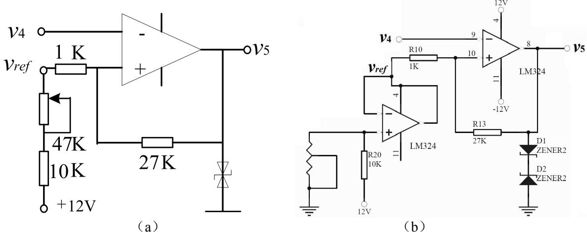 图 8(a)为提供给学生参考的原理图,图中迟滞比较器的参考电压 $\nu _ { r e f }$ 由电阻的分压获得。但是由于阻值为27k的反馈电阻存在,会将 $\nu _ { 5 H } = 7 . 3 \ : \mathrm { V }$ 和 $\nu _ { 5 L } = - 7 . 3 \mathrm { V }$ 的跳变反馈给 $\nu _ { r e f }$ ,使得 $\nu _ { r e f }$ 不稳定,从而使得迟滞比较器无法正常工作。图 8(b)所示为上述问题的一种解决方案,即利用运算放大器构建电压跟随电路将 $\nu _ { r e f }$ 稳定在所需电压值。