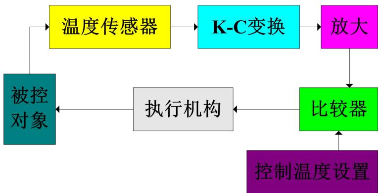 本实验需要完成的温度控制器的结构如图 1 所示。根据图 1,对被控对象的温度设定一个范围。流过 AD590 的电流等于器件所处环境的热力学温度度数,所以需要开氏温度—摄氏温度的转换,即 K-C 变换。执行机构由继电器代替。