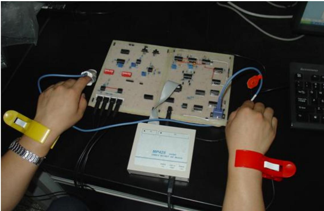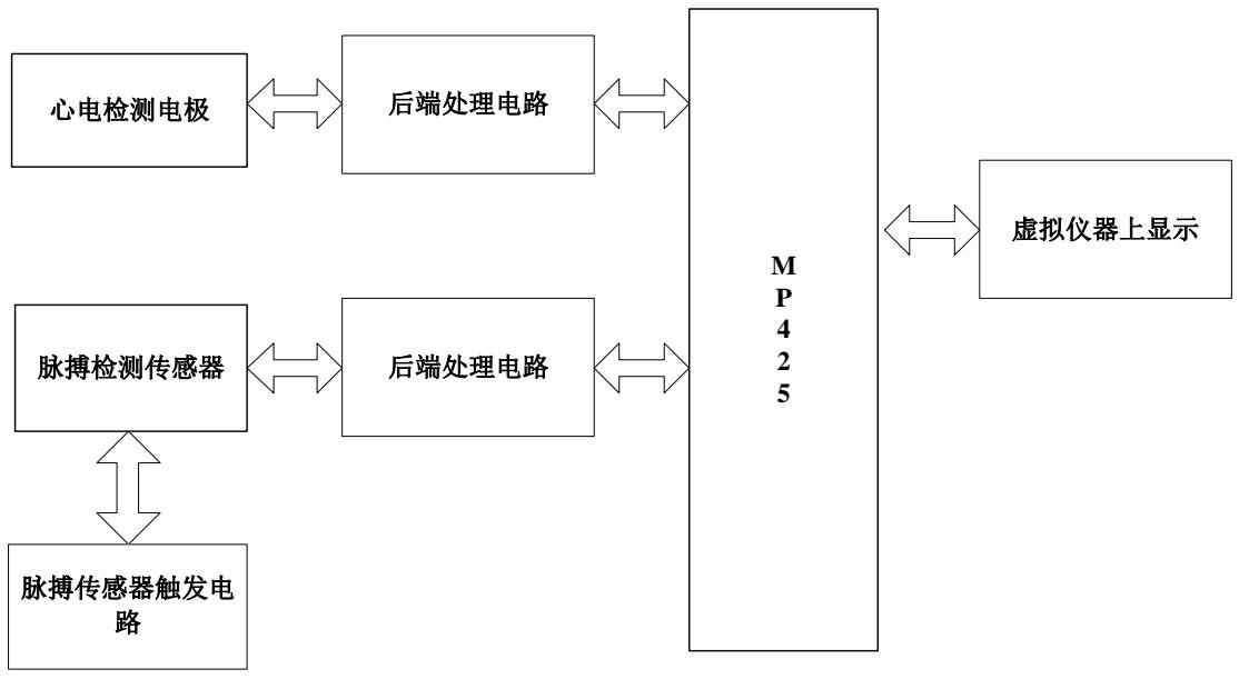 (5) 介绍 USB 接口数据采模块卡 MP425 工作原理和使用注意事项,引导学生设计同步检测电路,进而实现脉搏和心电信号同步检测。
