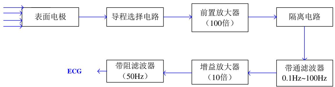 典型心电信号如图 2所示。根据心电信号特点设计调理电路如图 3所示,表面电极提取的心电信号经导联传送到前置放大器,进行前置放大,经带通滤波滤除直流信号及低频基线干扰后,由后级放大器放大,再经滤波器进一步滤除 $5 0 \mathrm { H z }$ 工频干扰后得到 $0 . 1 { \sim } 1 0 0 \mathrm { H z }$ 的有用心电信号,由 A/D转换后送至计算机。